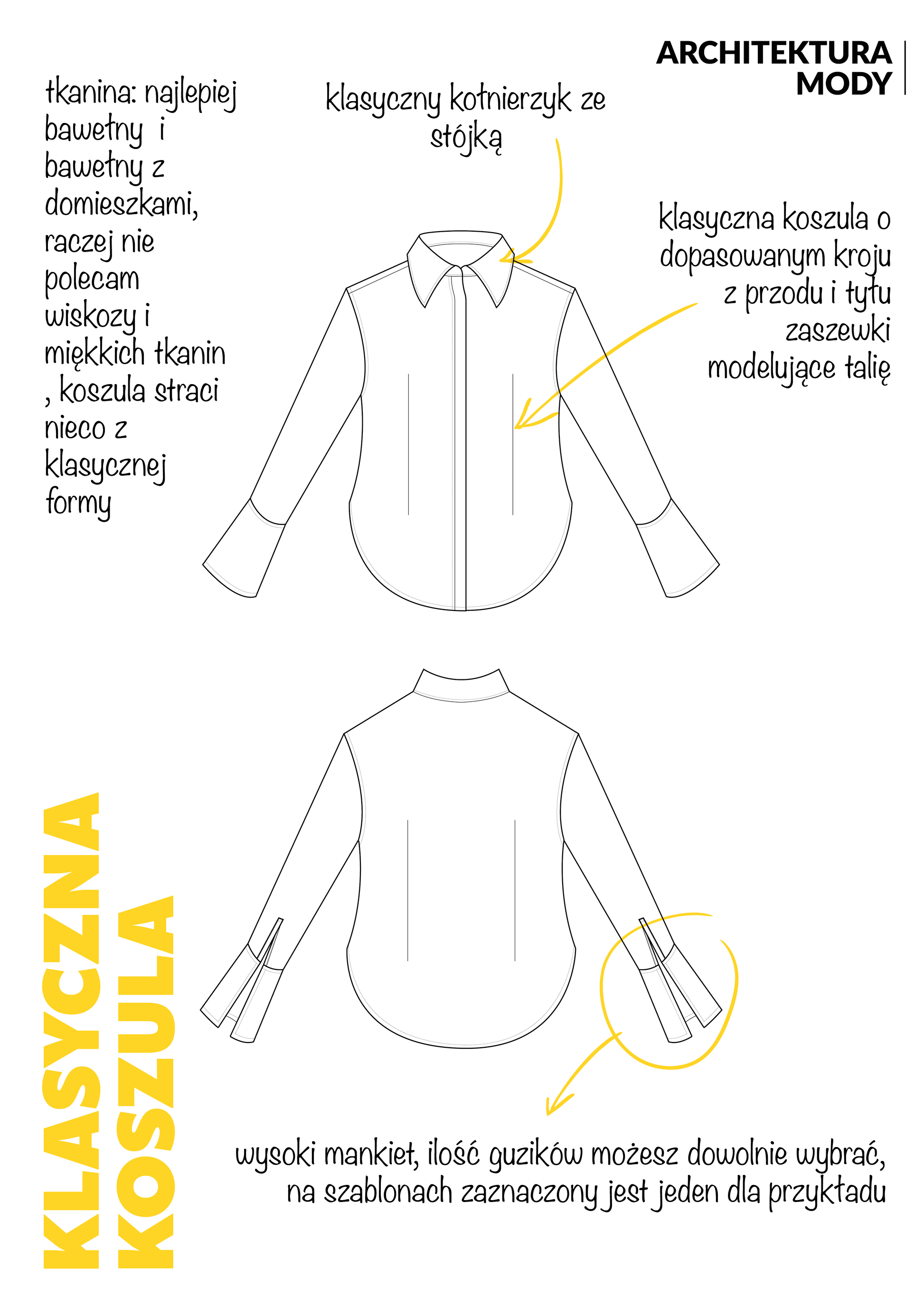 Klasyczna koszula z pionowymi zaszewkami, to ponadczasowy model. Idealna będzie z bawełny, tkanin koszulowych z domieszkami, tkanin koszulowych z elastanem.